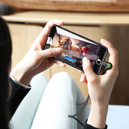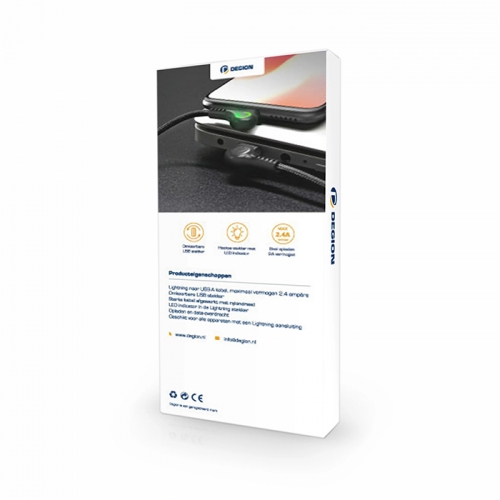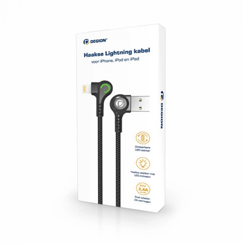De krachtige 2,4 ampère Lightning naar USB kabel van Degion laadt uw iPhone, iPod of iPad razendsnel op. De Lightning en USB stekker hebben beiden een bocht van 90º. De unieke USB aansluiting kan zowel naar links als naar rechts geplaatst worden.